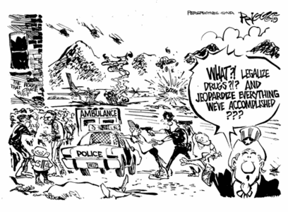 This toon rejected because the newspaper editorialized against legalizing drugs.
