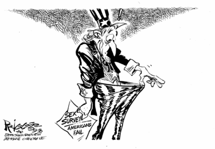 News Item: Americans failed a sex survey. The obvious cartoon is this one that was killed by the editor...because....he said I drew Uncle Sam's 'thing' in the reader's minds eye.
